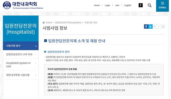 대한내과학회는 이 같은 문제를 해결하기 위해 입원전담전문의 교육 인증 프로그램(안)을 통해 입원전담전문의가 입원환자 진료에 필요한 분야 중심으로 관련된 분야의 최신 의학지식을 교육받을 수 있는 프로그램을 운영하여 입원전담전문의가 전문가 및 독립된 전문분야로서 발전할 기반을 제공하겠다는 방침이다.