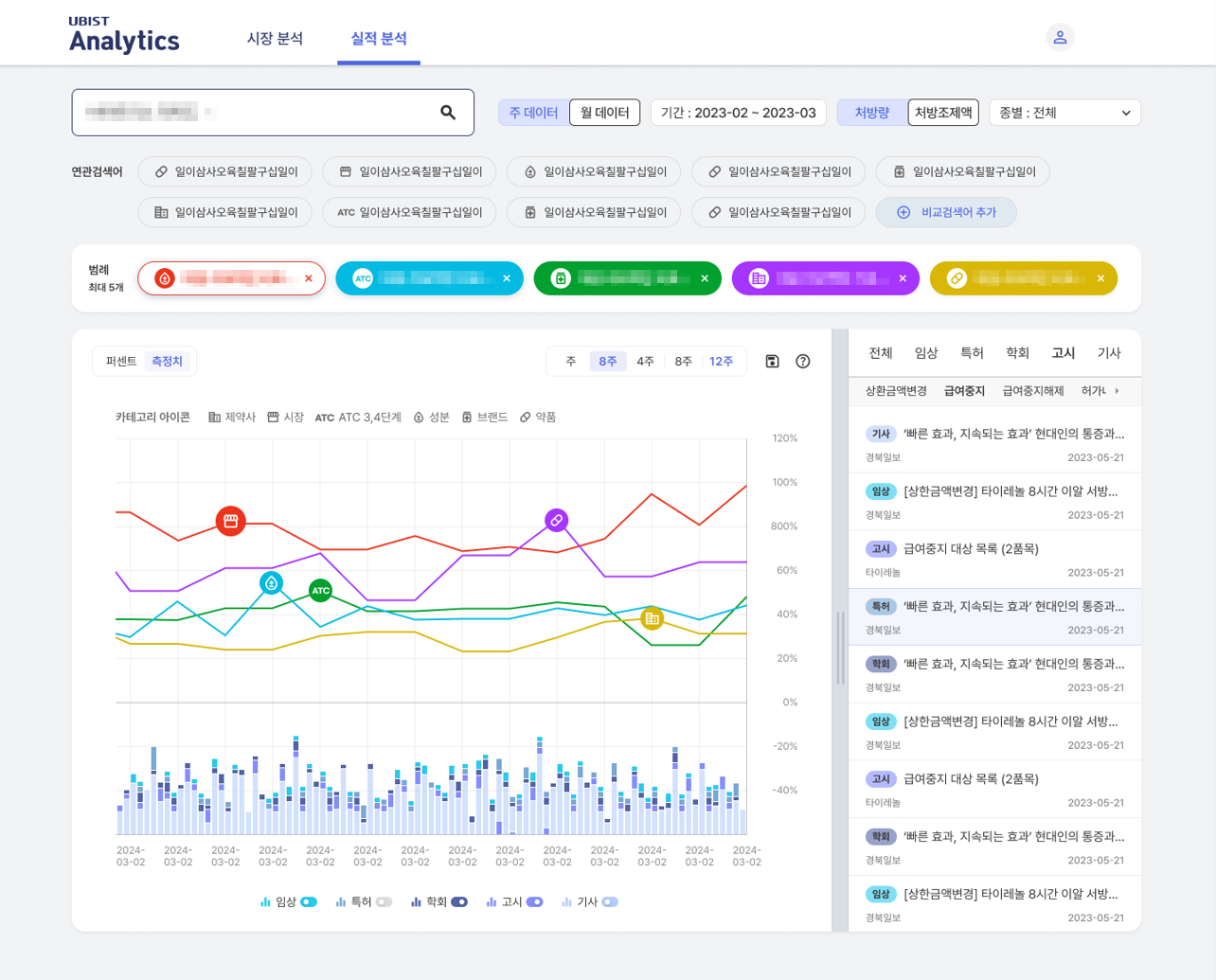 세부적으로는 제약사, 시장, 의약품 분류 코드(ATC), 성분, 브랜드, 약품 등 각기 다른 레벨의 데이터를 비교 분석할 수 있다. 또한, 매출이 발생하는 시점별로 기사, 특허, 고시, 임상, 학회 등 시장 이슈를 매칭해 제약사의 마케팅 활동을 한눈에 분석 가능한 UX/UI를 제공한다. 이를 통해 경쟁 시장의 규모 변화와 경쟁 제품 간 점유율 변화, 점유율 변동 원인까지 한눈에 조망 가능하다.