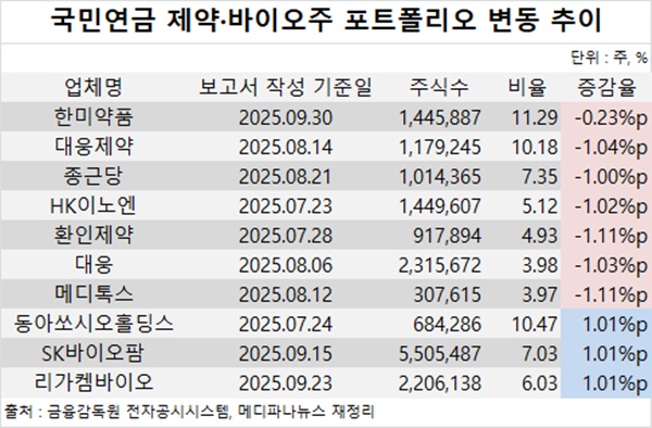 먼저 한미약품, 대웅제약, 대웅, 종근당, HK이노엔, 환인제약, 메디톡스 등 7개 제약사 및 지주사에 대한 지분율을 낮췄다.
