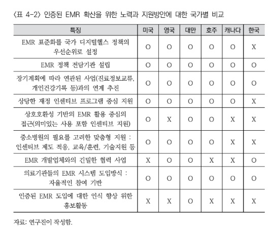한국보건사회연구원의 '전자의무기록(EMR) 인증제 확산을 위한 해외 사례 비교 연구'에 따르면, 국가마다 구체적인 지원액수, 기간, 방법은 달랐지만, 인센티브제도를 통해 재정 지원을 했다는 공통된 특징이 있다.
