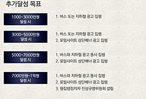모금액이 늘어날수록 버스나 지하철, 포털사이트 상단배너 광고 집행, 형집행정지자 진상규명위원회가 설립 등이 가능해진다.
