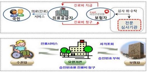 건보공단에서 가입자 여부 등을 확인한 다음 심평원에서 전문적인 내용을 심사하고, 다시 공단이 진료비를 지급, 사후관리를 하게 되는 것이다.