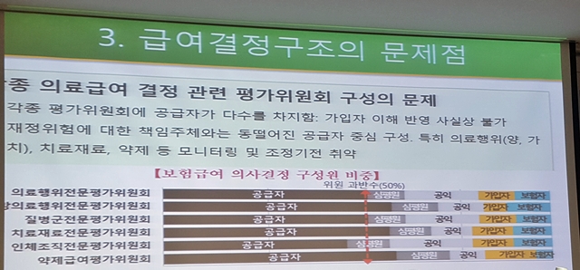 김 대표는 "이는 복지부 내 건강보험정책심의위원회와 심평원 내 전문평가위원회의 독점적인 의사 결정 구조에 따른 문제다. 건보공단의 법적 지위와 독립성을 보장해야 한다"고 주장했다.