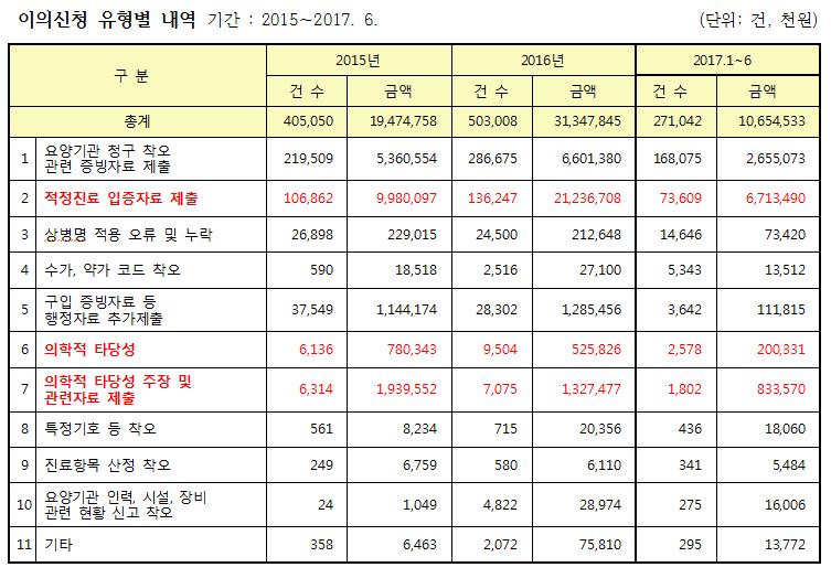 실제 최근 3년간(2015∼2017. 6.) 처리된 이의신청 유형별 통계를 살펴보면 이의신청 10건 중 약 3건은 의료기관에서 의학적 타당성을 입증해 인정된 경우였다.