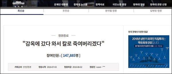 [메디파나뉴스 = 박민욱 기자] 의료기관 내 폭행 근절을 요구하는 청와대 국민 청원이 8월 2일 자정 기준 최종적으로 14만7885명을 기록하며 결국 20만 명을 넘지 못했다.