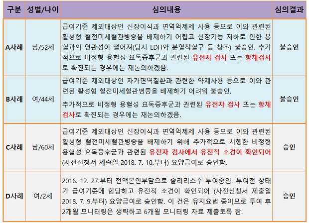 반대로 승인 사례를 보면, 환자 C도 A와 B같은 상황이지만 유전자 검사에서 aHUS 소견이 확인됐으니 급여 통과라는 것이다.