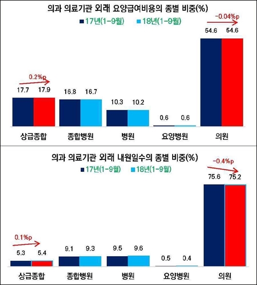 한국보건사회연구원은 건강보험심사평가원의 자료를 통해 2017년 1월에서 9월의 의과 의료기관 외래 요양급여비용 및 외래 내원일수 종별 비중을 2018년 같은 시기와 비교 분석했다.