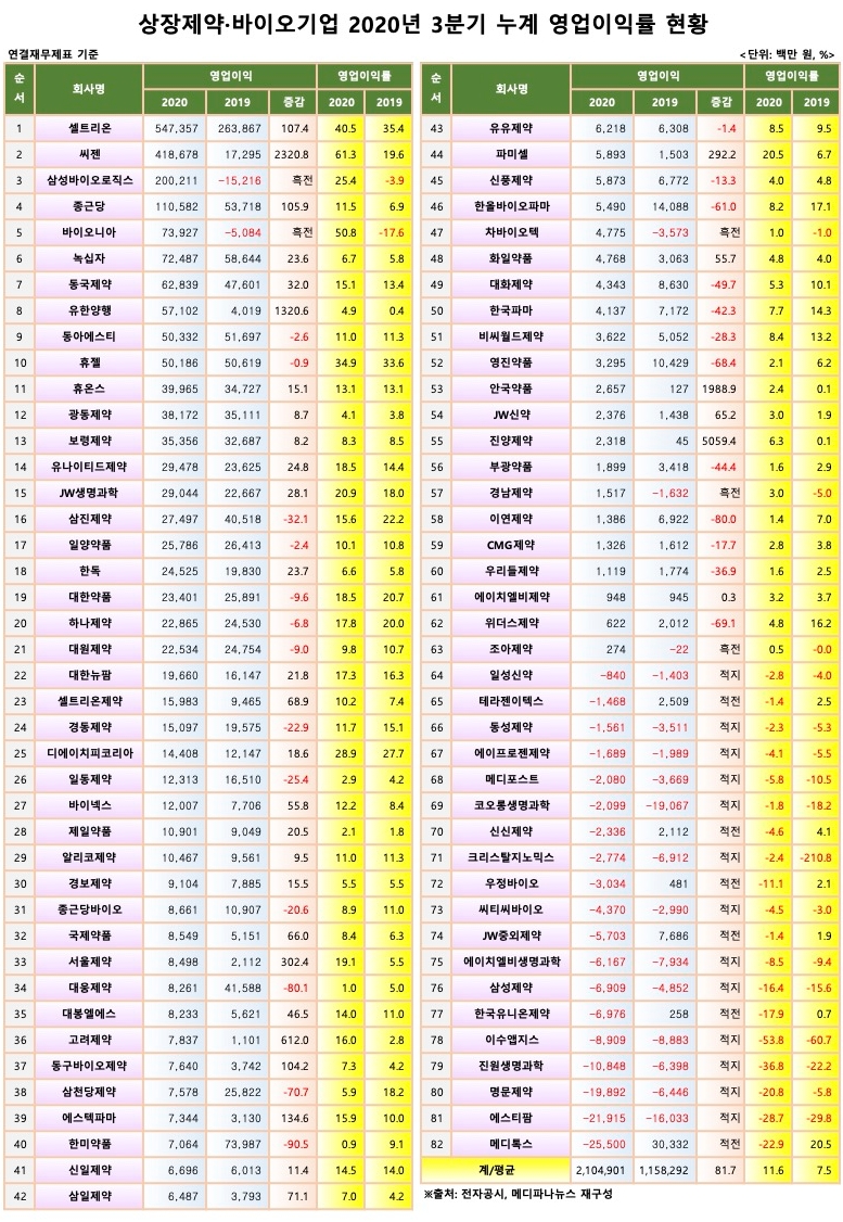 메디파나뉴스가 82개 상장제약·바이오기업의 2020년도 3분기 누계 보고서를 토대로 분석한 영업이익률 현황에 따르면 이 기간 동안 올린 매출 18조854억 원 중 영업이익은 2조1049억 원 규모였다. 이에 따른 영업이익률은 11.6%로 전년 동기 7.5% 대비 4.1%p 증가한 수익률을 기록했다.