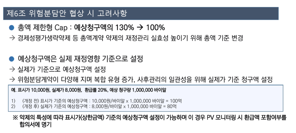 이에 주요 내용을 살펴보면 ▲위험분담 대상 ▲위험분담제 계약 체결 ▲위험분담안 협상 시 고려사항 ▲위험분담계약서 작성 ▲위험분담환급액 금융비용 ▲지연손해금 ▲담보제공 등이 변화됐다.