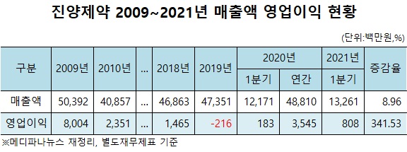 진양제약은 2009년 504억원을 기록하면서 처음으로 500억대 매출액을 달성한 바 있다.
