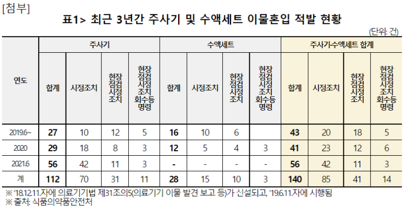 2019년 6월 27건에 달하던 주사기 이물혼입 적발은 2020년 29건, 2021년 6월 기준 56건으로 급증했다. 2021년 6월 현재 적발된 56건은 2019년 동월 대비 2배 이상 증가한 수치다.