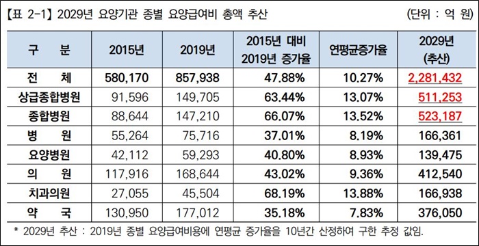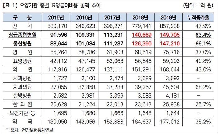 특히 문재인 케어 시행 직후인 2018년 의료기관 종별 요양급여비 총액도 2017년 대비 상급종합병원은 24.2%(113,231억 원 → 140,669억 원), 종합병원은 13.6%(111,237억 원 → 126,390억 원) 급증했다.