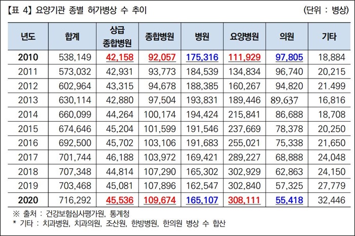 건강보험심사평가원의 '요양기관 종별 허가병상 수 추이'에 따르면, 상급종합병원과 종합병원은 2010년 대비 2020년 현재 각각 3,378병상과 17,617병상이 증가, 병원과 의원은 지난 10년간 각각 10,209병상과 42,387병상이 감소한 것으로 나타났다.
