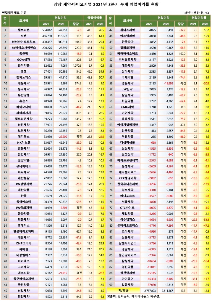 메디파나뉴스가 상장 제약·바이오기업 90곳의 2021년도 3분기 누계 보고서를 토대로 분석한 영업이익률 현황에 따르면 이 기간 동안 올린 매출 20조5724억 원 중 영업이익은 2조7579억 원 규모였다. 이에 따른 영업이익률은 13.4%로 전년 동기 12.4% 대비 1.0%p 증가한 수익률을 보였다.