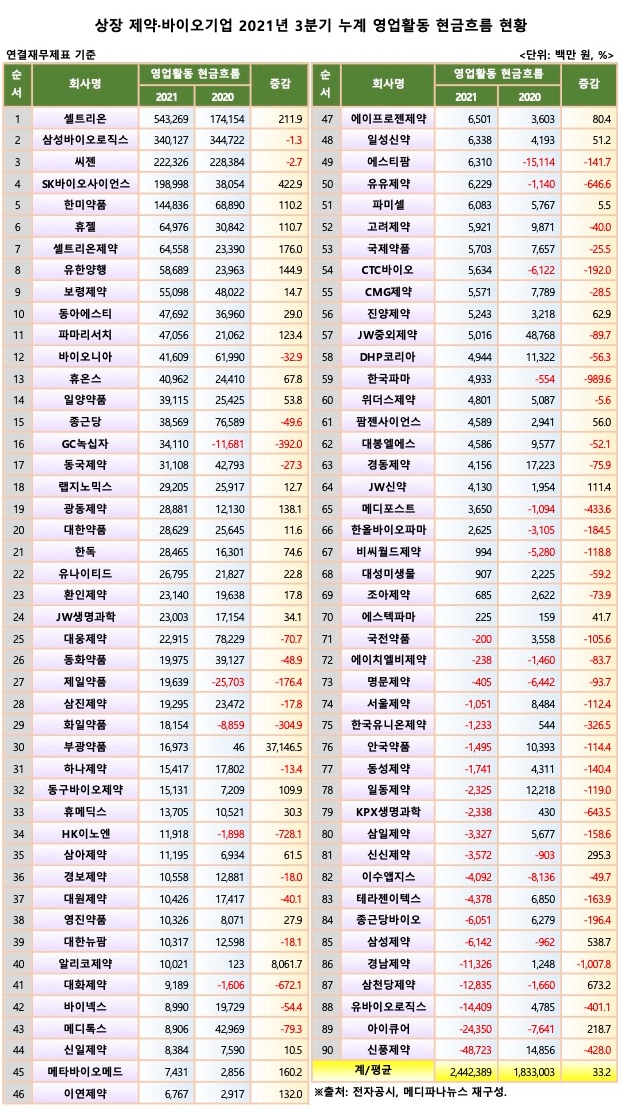메디파나뉴스가 90개 상장 제약·바이오기업의 3분기 누계 현금흐름표(연결기준) 중 '영업활동으로 인한 현금흐름(Cash From Operation, CFO)'을 집계한 결과 지난해 같은 기간 1조8330억 원 대비 33.2% 증가한 2조4424억 원으로 집계됐다.