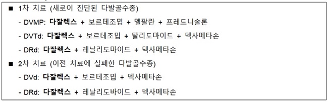 하지만 1차 및 2차 치료에 대해서는 2021년 5월 1일 다라투무맙 병용요법의 병용 약제에만 급여가 이뤄졌다. 병용 약제는 5%만 본인부담을 하면 되지만, 다잘렉스는 100% 본인부담을 해야 한다.