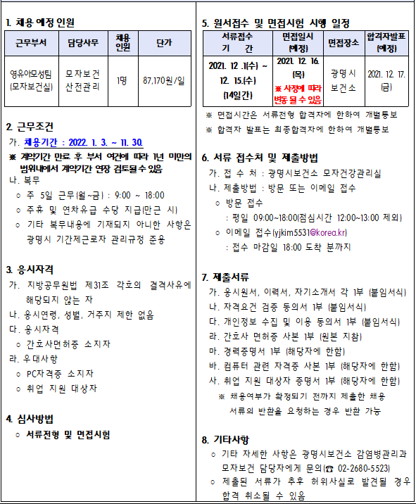 광명시보건소 모자보건실 간호사(기간제근로자) 공개채용 계획을 다음과 같이 공고한다.