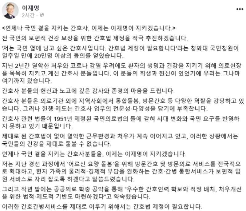 11일 이재명 더불어민주당 대통령 후보는 페이스북을 통해 '언제나 국민 곁을 지키는 간호사, 이제는 이재명이 지키겠습니다'라는 제목으로 간호법 제정 추진에 대한 의견을 전달했다.