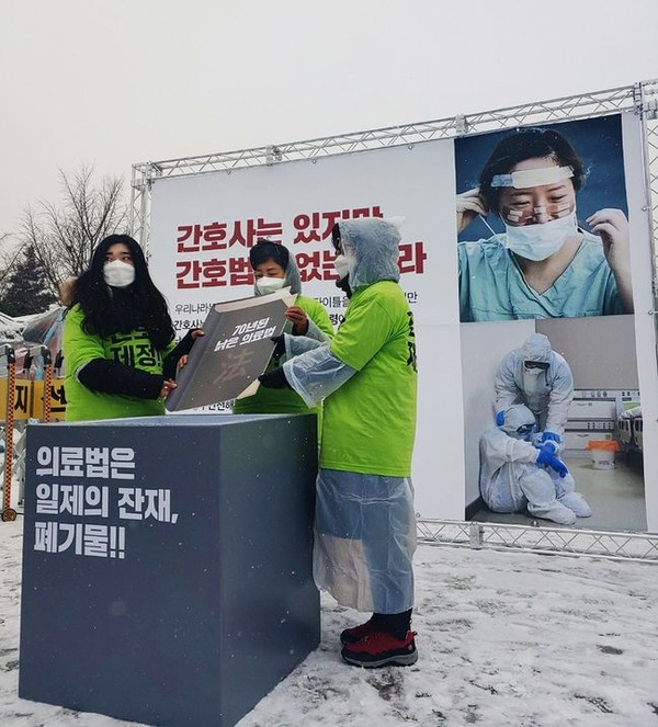 대한간호협회(회장 신경림)는 지난해 11월 간호법 제정 촉구 전국 간호사 결의대회를 시작으로, 두 달 가까이 국회 앞에서 간호법 제정 촉구 집회를 이어가고 있다. 이날도 국회 정문 앞과 현대캐피탈 빌딩, 금산 빌딩을 비롯해 더불어민주당, 국민의힘 당사 앞 등 모두 5곳에서 대형보드와 피켓, 현수막을 이용한 집회를 진행했다.