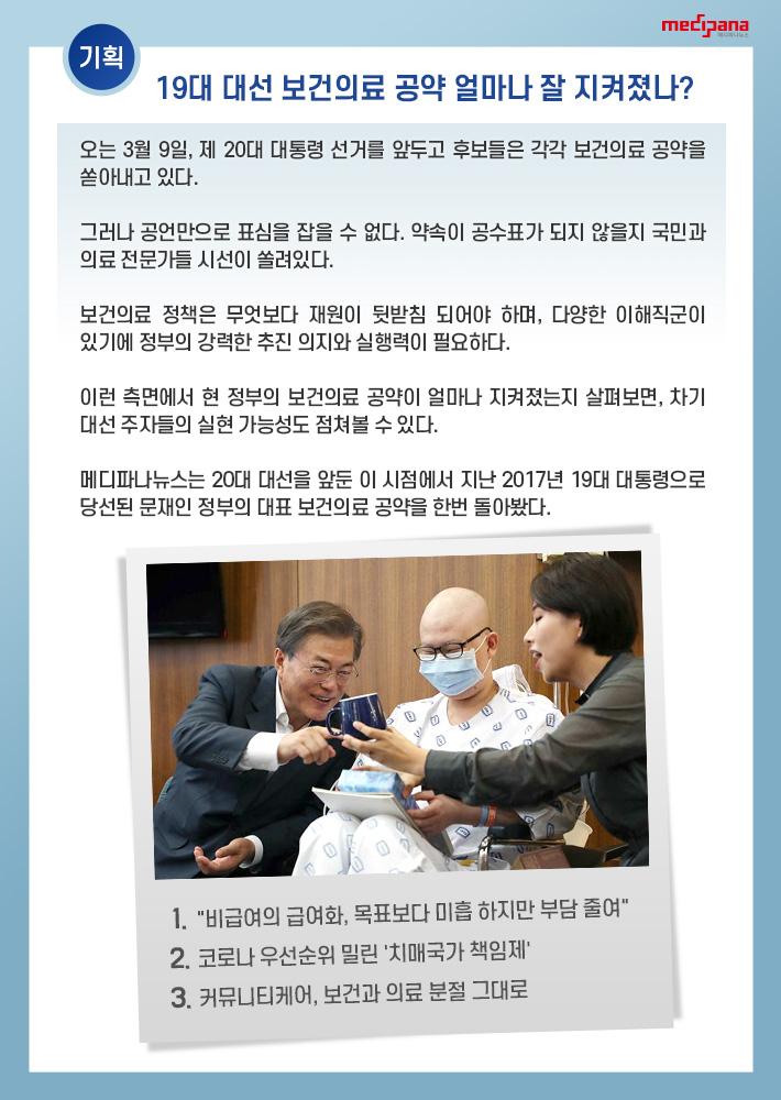 [메디파나뉴스 = 박민욱 기자] 2017년 5월 박근혜 대통령 탄핵 국면에서 실시된 제19대 대통령 선거를 앞두고 당시 문재인 더불어민주당 후보는 '건강보험 보장성 강화'에 초점을 맞춘 공약을 내놓았다.
