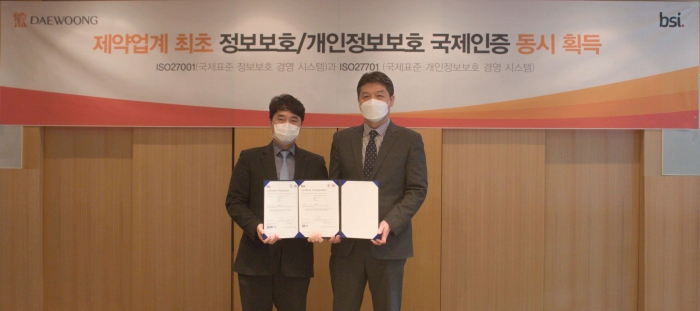 [메디파나뉴스 = 김창원 기자] 대웅제약(대표 이창재·전승호)은 제약업계 최초로 국제표준 정보보호 인증 ISO27001 및 국제표준 개인정보보호 인증 ISO27701을 동시에 획득했다고 밝혔다. 인증서 수여식은 지난 23일 대웅제약 본사에서 이창재 대표와 BSI그룹코리아 임성환 대표 등이 참석한 가운데 진행됐다.