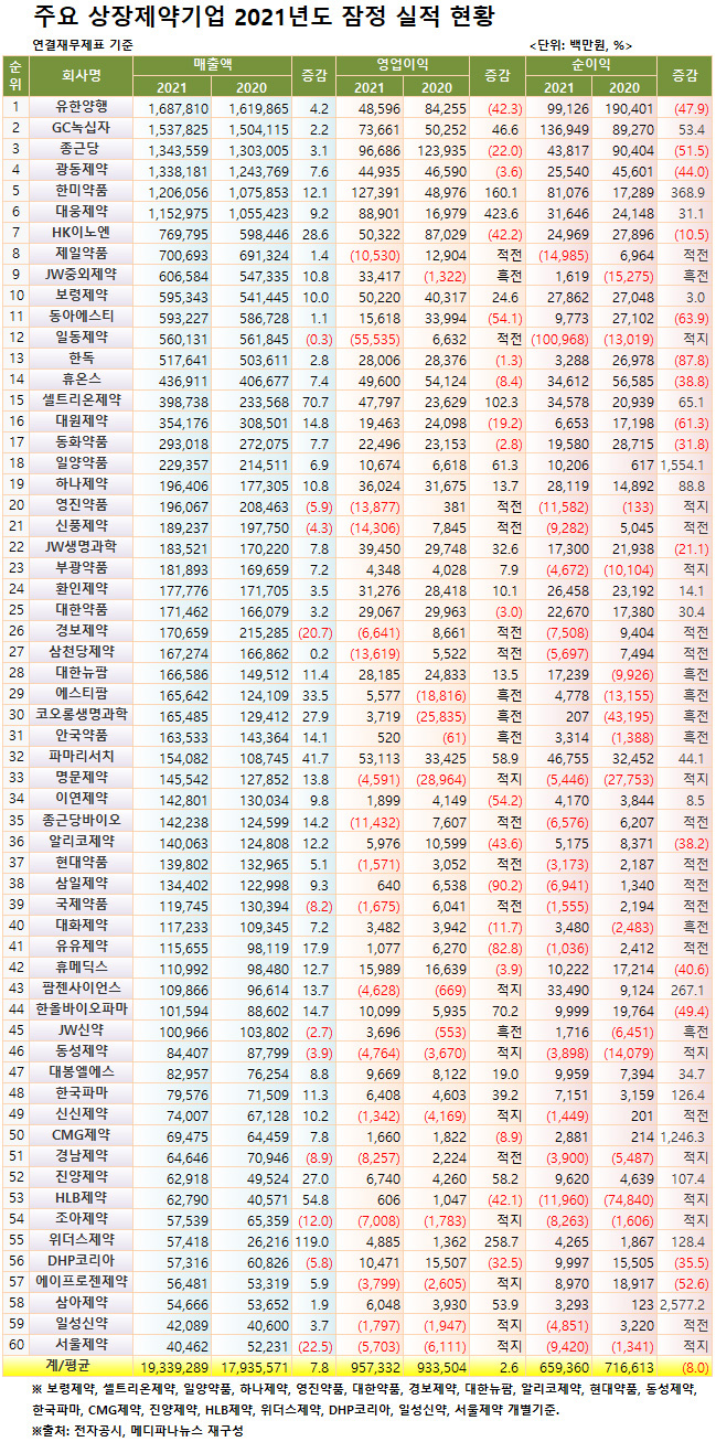 메디파나뉴스가 2021년도 잠정실적을 공시한 12월말 결산 60개 상장제약기업들(11월말 결산 현대약품 포함, 셀트리온 등 바이오기업 제외)을 대상으로 집계한 자료에 따르면 매출은 17조 9,355억에서 19억 3,392억원 규모로 7.8% 성장했다. 영업이익은 9,573억원을 올려 전년대비 2.6% 늘어난 반면 당기순이익은 8% 감소한 6,593억원을 올리는데 그쳤다.