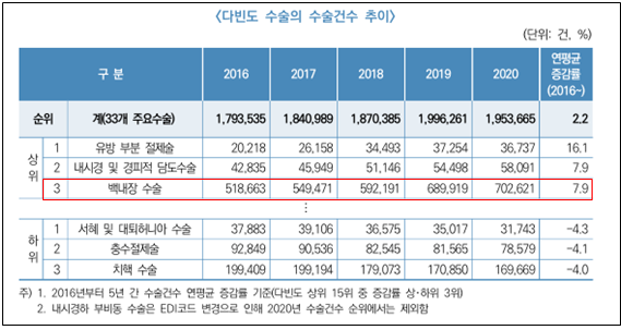 실제로 건강보험심사평가원 수술 통계 연보에 따르면 2016년부터 2020년까지 백내장 수술 건수는 해마다 7.9%씩 꾸준히 상승했다. 특히 2020년 백내장 수술 건수는 70만 2,621건으로 5년 전인 2016년 51만8,663건보다 35%나 늘어났다.