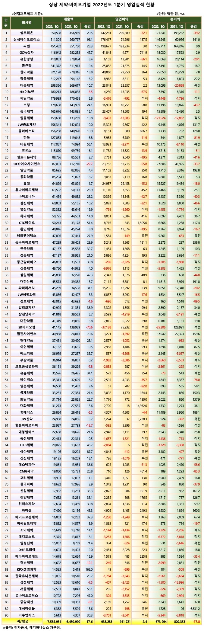 셀트리온이 지난해 1분기 4570억 원에서 올해 1분기에는 5506억 원으로 20.5% 증가했고, 여기에 삼성바이오로직스가 2608억 원에서 96.1%나 증가한 5113억 원을 달성해 2위로 뛰어올랐다.