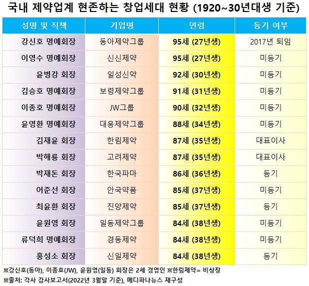 `나이는 생물학적 숫자에 불과하다`는 말처럼 제약업계에는 1920~30년대생 창업세대들 중에는 이처럼 대표이사 또는 등기이사 등을 맡아 최고경영자 역할을 하고 있다. 또 일부는 미등기 임원이지만, 직간접적으로 경영자문을 하기도 한다.