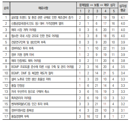 실제로 심각성 평균을 보면 ▲글로벌 트렌드 및 환경 관련 규제로 인한 제조경비 증가가 4.1로 가장 높았고, 뒤이어 ▲신흥공업국(중국, 인도 등) 대비 가격경쟁력 열위 ▲해외 시장 개척 어려움 ▲협소한 국내 시장 규모로 인한 판로 어려움 등이 4점대였다.