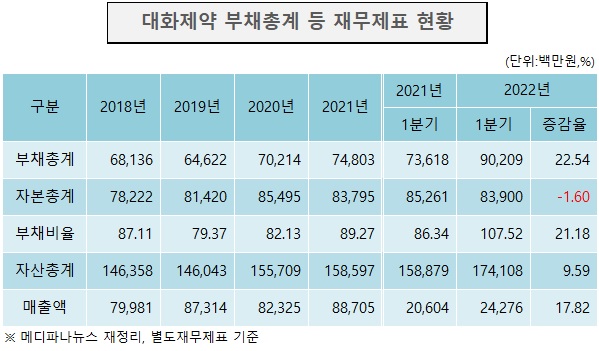 대화제약이 한국거래소에 제출한 분기 보고서에 따르면, 대화제약 별도재무제표 기준 부채총계는 올해 1분기 902억원으로 전년 동기 736억원 대비 22.5% 증가했다.