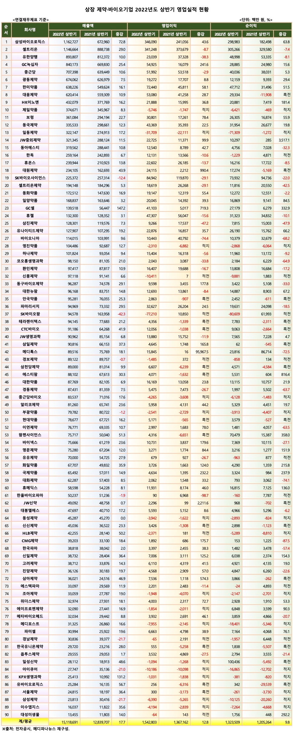 영업이익과 순이익에서는 상위사 중 전통 제약사들이 강세를 보인 반면 바이오 기업들은 약세를 보였다.