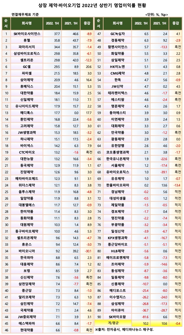 메디파나뉴스가 90개 상장 제약·바이오기업의 2022년도 반기보고서를 토대로 분석한 영업이익률 현황에 따르면 상반기 동안 올린 매출 15조1187억 원 중 1조5428억 원의 영업이익을 남겨 평균 10.2%의 영업이익률을 기록했다. 지난해 같은 기간 10.6% 대비 0.4%p 낮아진 수치다.