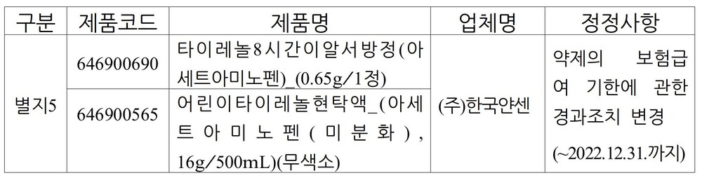 이와 관련 대한약사회는 회원 대상 문자메세지를 통해 "지난 2월 약제급여목록 및 급여상한금액표 일부개정 고시에 의해 9월 1일자로 보험급여 코드 삭제 예정이었던 '타이레놀8시간이알서방정'과 '어린이타이레놀현탁액'의 고시 적용일자가 12월 31일까지 유예됐다"고 설명했다.