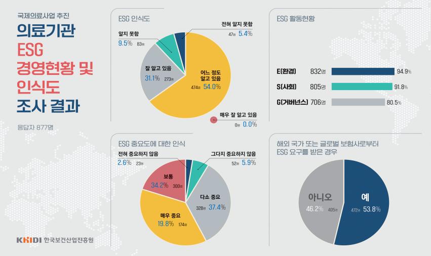 한국보건산업진흥원(원장 직무대행 김영옥 기획이사) 국제의료전략단 국제의료시장분석팀은 16일 국제의료사업을 추진하는 의료기관 종사자를 대상으로 실시한 '2022년 의료기관 ESG 인식도 및 경영현황 조사' 결과를 발표했다.