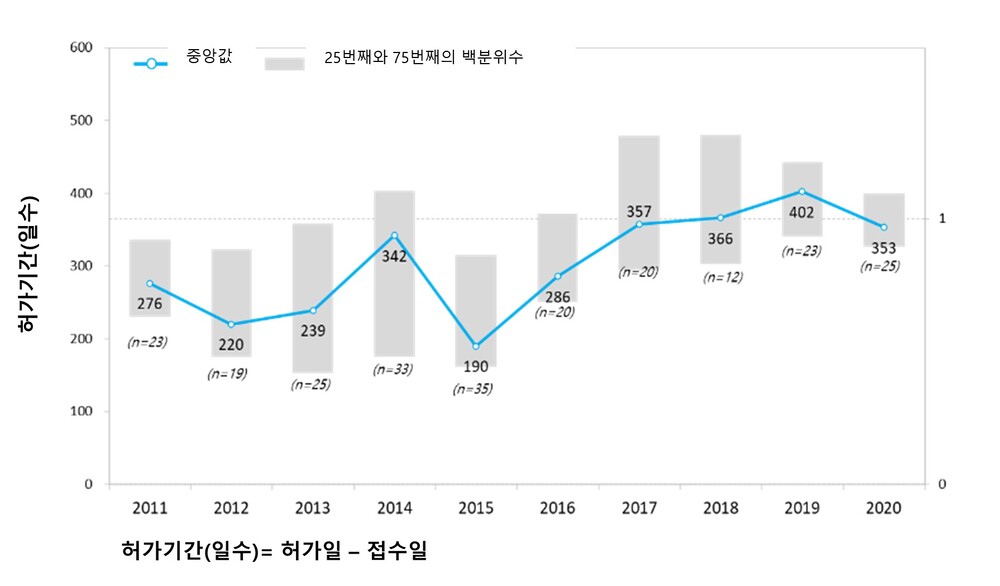 한편, 2020년에는 코로나19 팬데믹 상황에도 불구하고 전년도 대비 허가심사 기간이 오히려 감소한 것은 매우 고무적인 부분이었다. (2019년 중앙값 : 402일, 2020년 중앙값 : 353일).