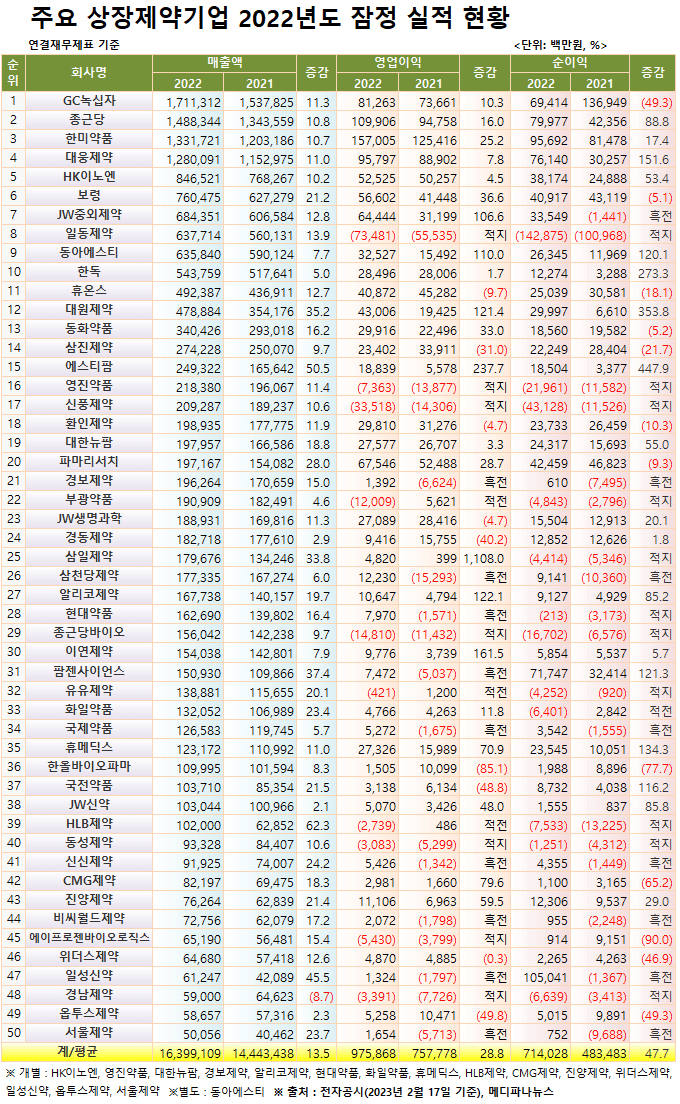 메디파나뉴스가 지난 17일까지 2022년도 잠정실적을 공시한 50개 상장제약기업을 대상으로 집계한 결과, 매출은 평균 13.5%, 영업이익은 28.8%, 당기순이익은 47.7% 증가했다. 이는 SK바이오사이언스와 SK바이오팜 실적을 제외한 것으로 이들 2개사를 포함하면 영업이익과 순이익 모두 두자릿수 감소세로 돌아선다.