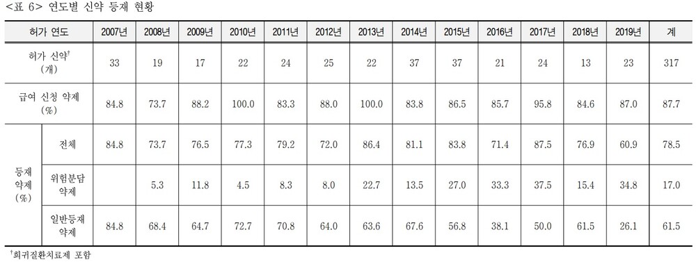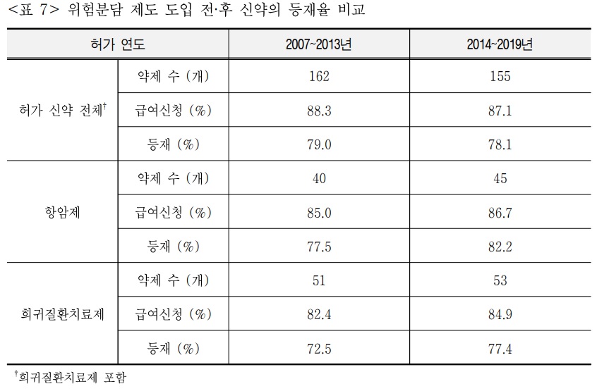2007년부터 2013년까지 162개의 신약이 허가를 받았으며 이 중 88.3%가 급여를 신청했고 79.0%가 건강보험에 등재됐다. 위험분담제가 도입된 2014년부터 2019년까지는 155개의 허가 신약 중 87.1%가 급여를 신청했고 78.1%가 건강보험에 등재됐다.