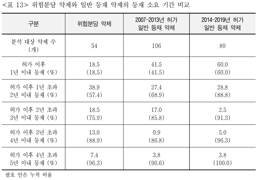 대부분의 약제가 허가 이후 3년 이내 등재됐으며, 허가 이후 5년 이내에 등재되는 비중은 위험분담 약제가 위험분담제 도입 이전에 허가된 일반 등재 약제보다 높았다. 이 중에서도 항암제와 희귀질환 치료제가 크게 증가했다.