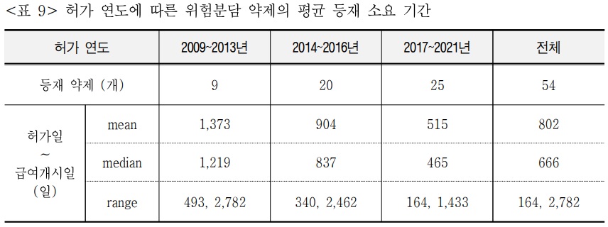 2022년 7월까지 계약 및 등재된 이력이 있는 위험분담 약제를 분석한 결과, 위험분담 약제 54개의 허가일로부터 건강보험 급여개시일까지 걸리는 총 소요 기간은 802일(약 2년 3개월)이었다.