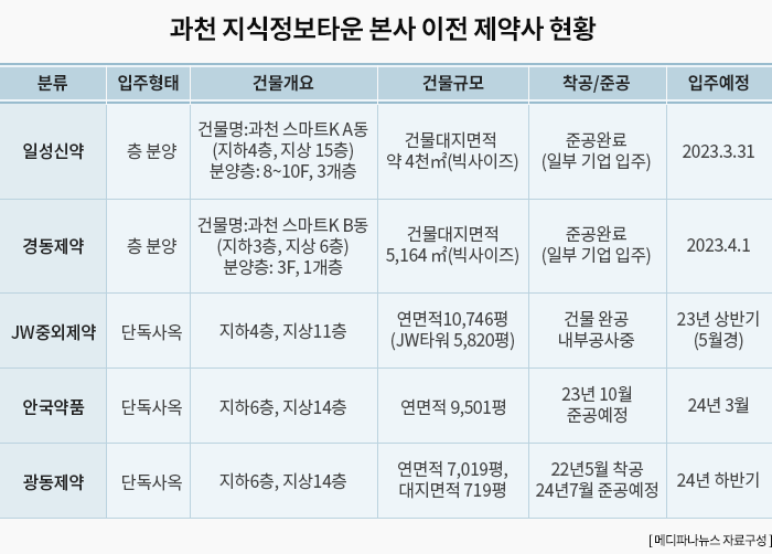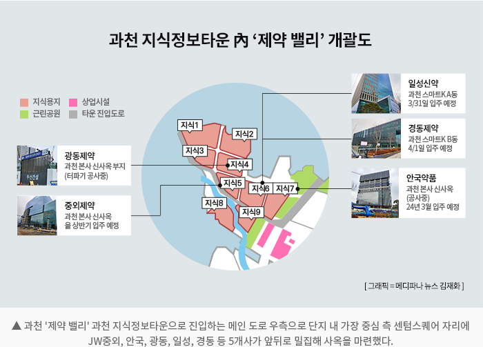 이달 말 일성신약을 필두로 경동제약, 중외제약, 안국약품, 광동제약 등 5개사가 내년까지 차례로 과천지식정보타운으로 본사를 이전한다.
