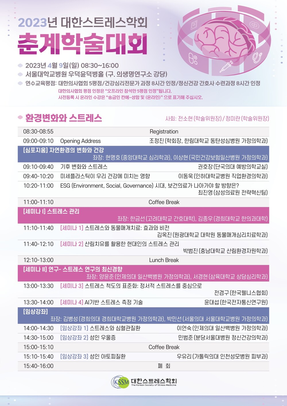 이번 학술대회는 화상회의 플랫폼 '줌(ZOOM)'을 통해 실시간 생중계될 예정으로 대한스트레스학회 홈페이지에서 온·오프라인 선택 등록이 가능하다. 대한의사협회 5평점(오프라인 참석자 한정), 건강심리전문가 과정 8시간 인정, 정신건강 간호사 수련과정 8시간이 인정된다.