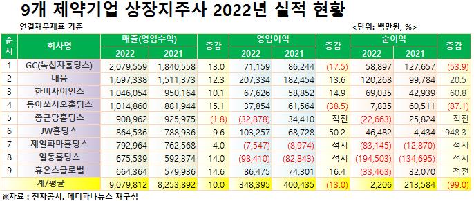 메디파나뉴스가 9개 제약기업 상장 지주사들의 2022년도 감사보고서(연결 기준)를 집계한 자료에 따르면 매출(영업수익)은 평균 10% 성장했다. 반면 영업이익 13%, 당기순이익은 99% 급감하는 성적표를 내놓았다.