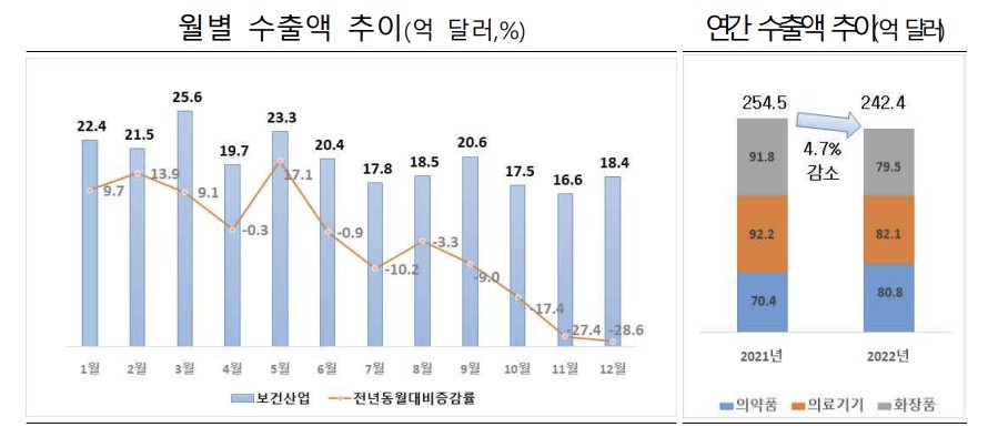 분야별로는 의료기기 82억달러(-11.0%), 의약품 81억달러(+14.8%), 화장품 80억달러(-13.4%) 순이었으며, 유일하게 의약품만 수출액이 증가했다.