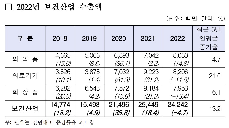 6일 한국보건산업진흥원은 2022년 의약품·의료기기·화장품 등 보건산업 수출 실적을 발표했다.