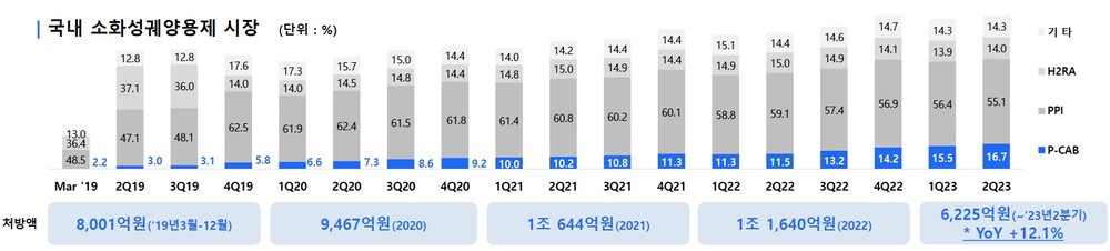 국내 첫 P-CAB 제제인 HK이노엔 '케이캡(성분명 테고프라잔)'이 출시된 2019년 2분기 PPI 제제의 점유율이 47.1%, H2RA 제제가 37.1%로 사실상 시장을 양분하고 있었고, P-CAB 제제 점유율은 3.0%에 불과했다.