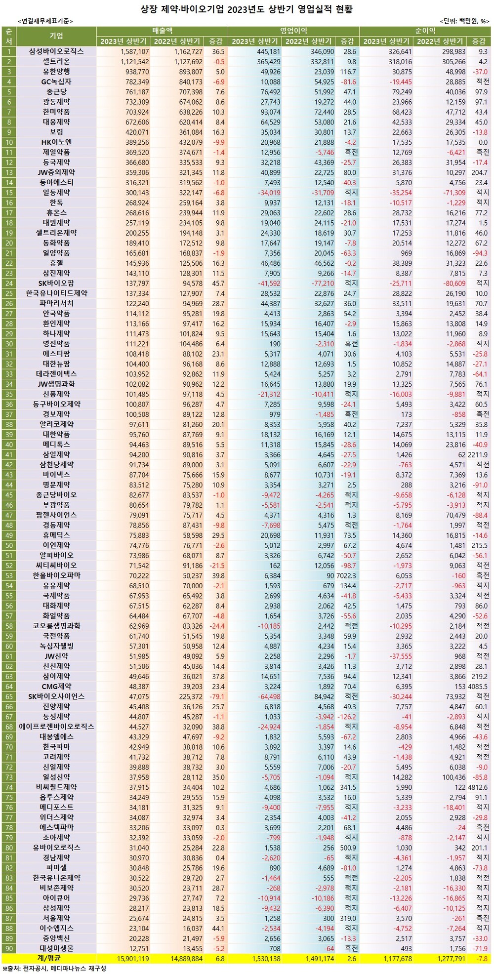 메디파나뉴스가 90개 상장 제약·바이오기업의 연결재무제표 기준 2023년도 상반기 실적을 집계한 결과, 총 매출액은 전년 동기 대비 평균 6.7% 증가한 15조9011억원을 달성한 것으로 조사됐다.