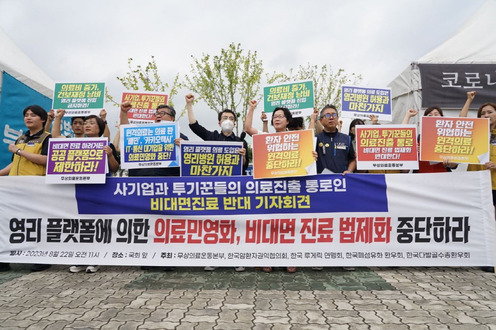 무상의료운동본부는 "방만한 기업들에 운영과 관리를 떠넘기는 게 아니라 당연히 필요하다면 플랫폼을 국가가 운영하고 부작용을 직접 관리해야 마땅하다"며 "비대면진료가 환자를 위한 것이라면 정부와 국회는 영리 플랫폼 진출을 금지하고 공공플랫폼으로 제한하라는 요구에 답을 해야 한다"고 촉구했다.