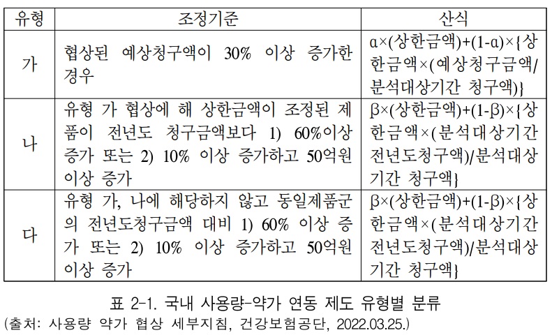 사용량-약가 연동제는 2006년 12월 29일 약제비 적정화 방안의 일부로 도입됐으며, 2014년 이후 산식에 의한 가격을 협상참고가격으로 활용해 가, 나, 다 세 유형으로 운영하고 있다.