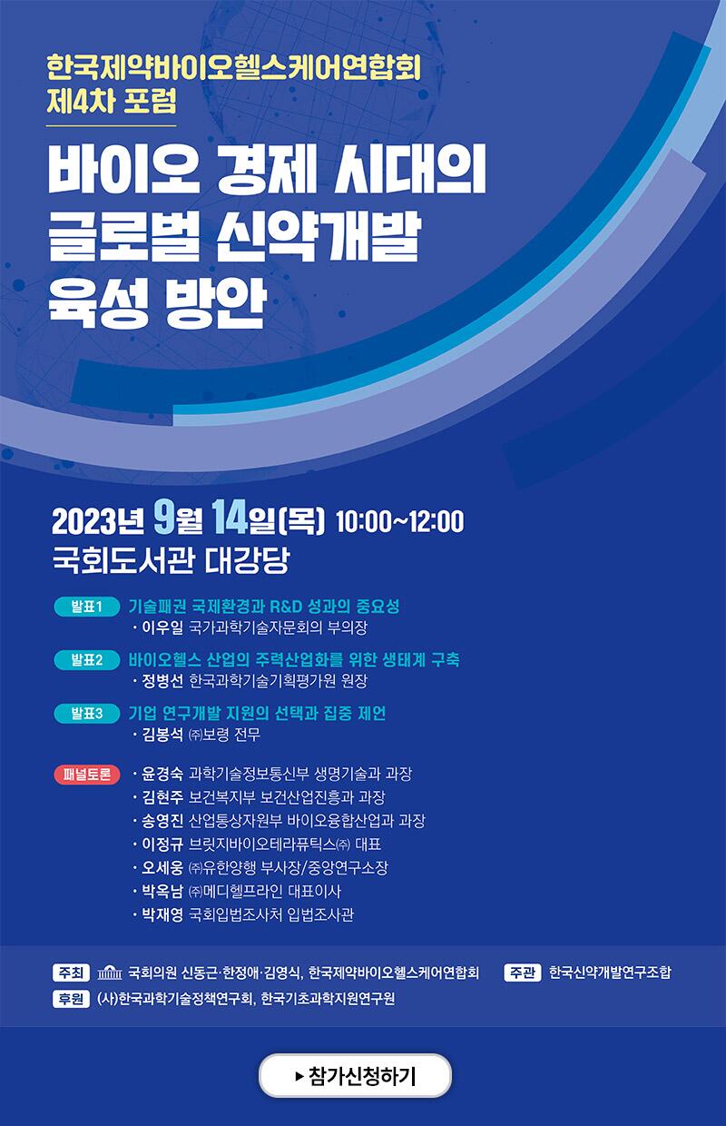 이번 포럼은 한국제약바이오헬스케어연합회와 신동근 국회의원(보건복지위원회 위원장), 한정애 국회의원, 김영식 국회의원과 함께 공동 주최한다.